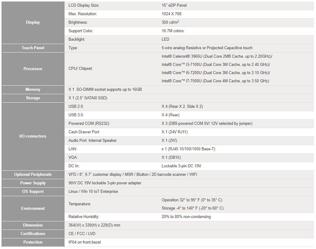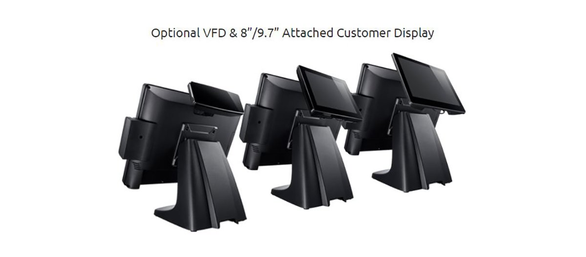 - Optional VFD & 9.7” customer Display, 2D Barcode Scanner, MSR, iButton, WiFi